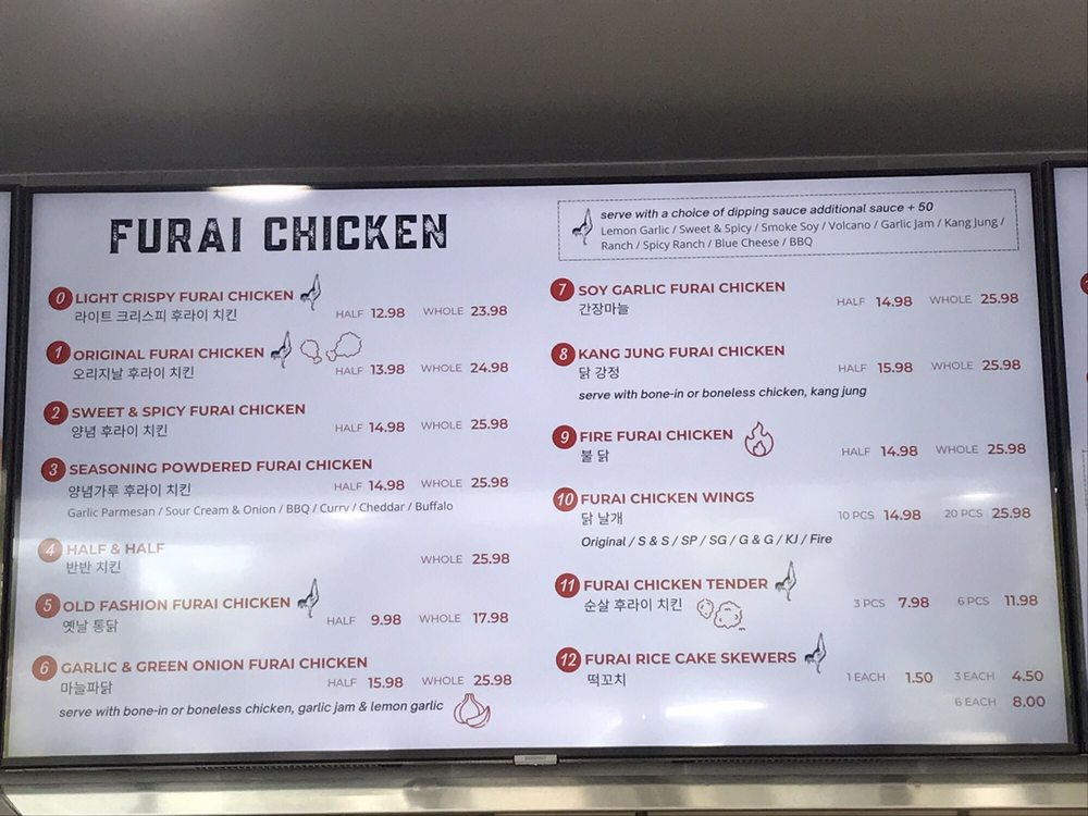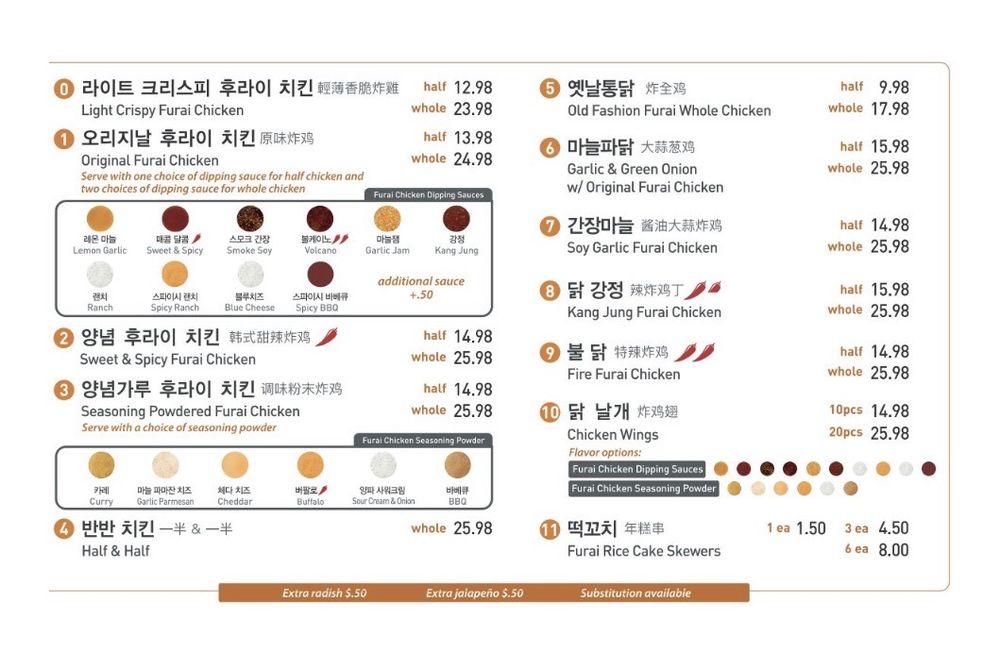 - Signature Dishes: Try their Light Crispy Furai Chicken, available in half or whole, served with tangy pickled radish and jalapenos. The Boneless Garlic & Green Onion Chicken is a must-try for its flavorful sauces.